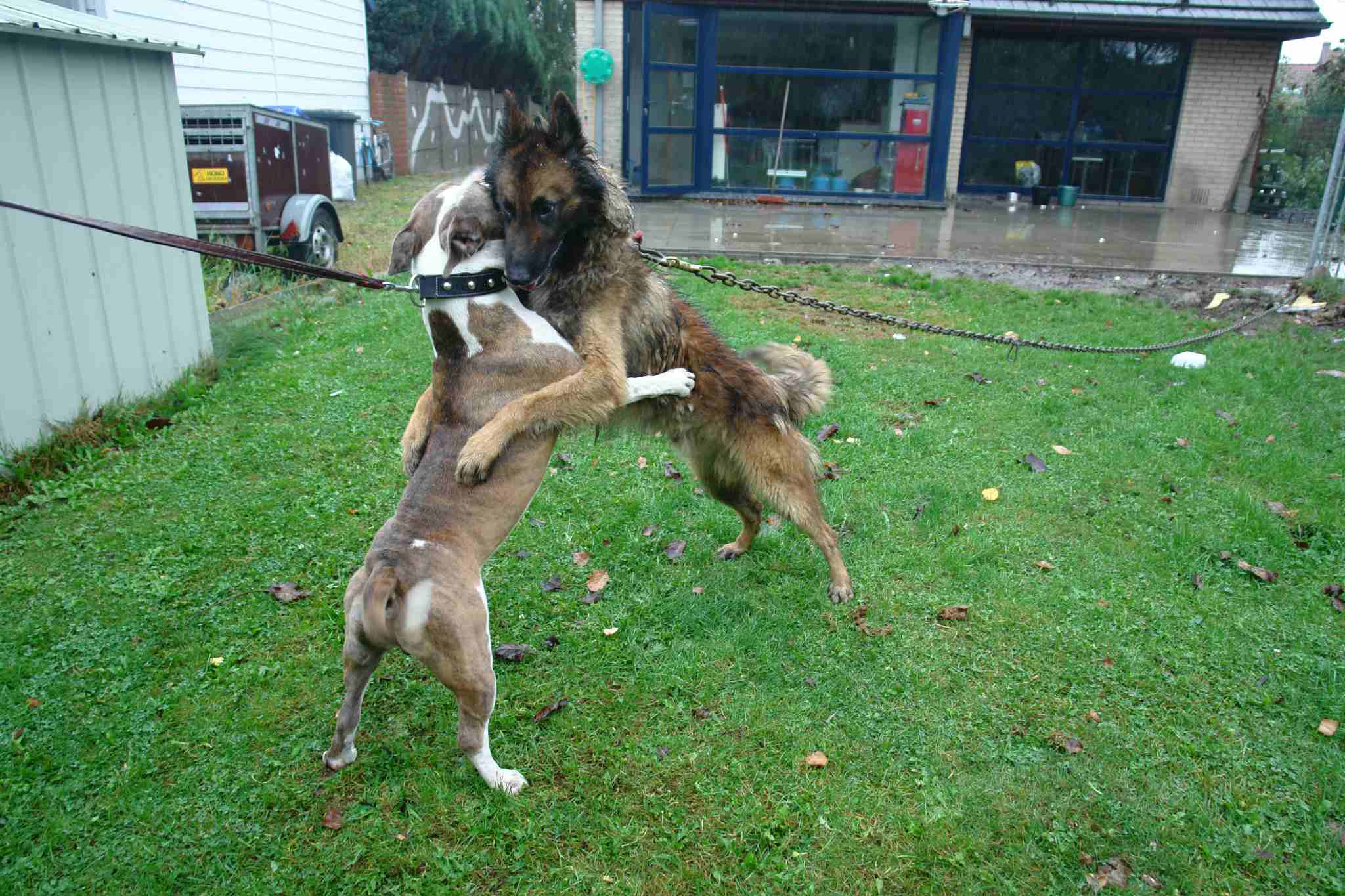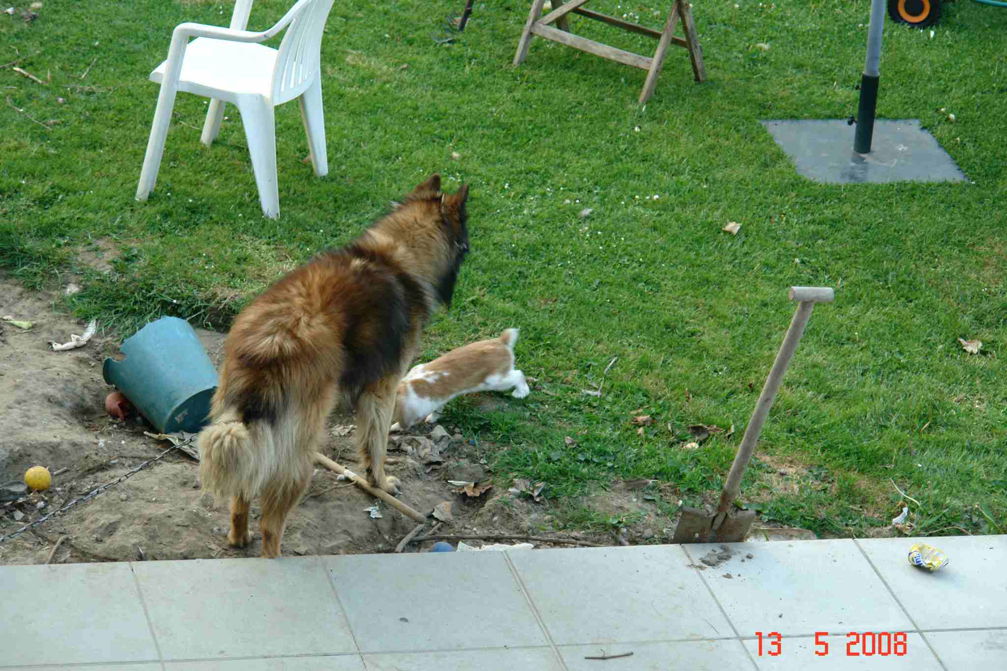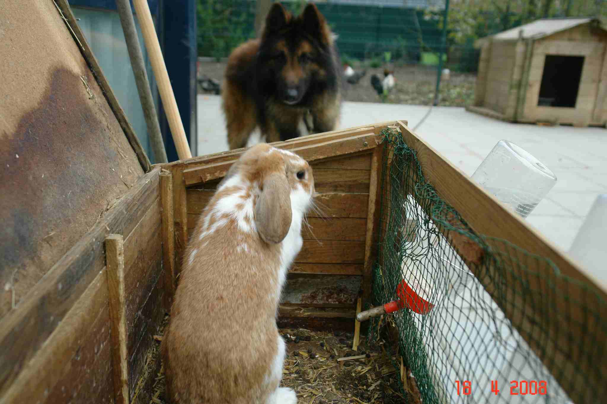 18 april 2008: gevaarlijke combinatie. Elgos is opgegroeid met een klein konijntje, maar dat is na ruim twee jaar dan toch instinctief misgelopen. |